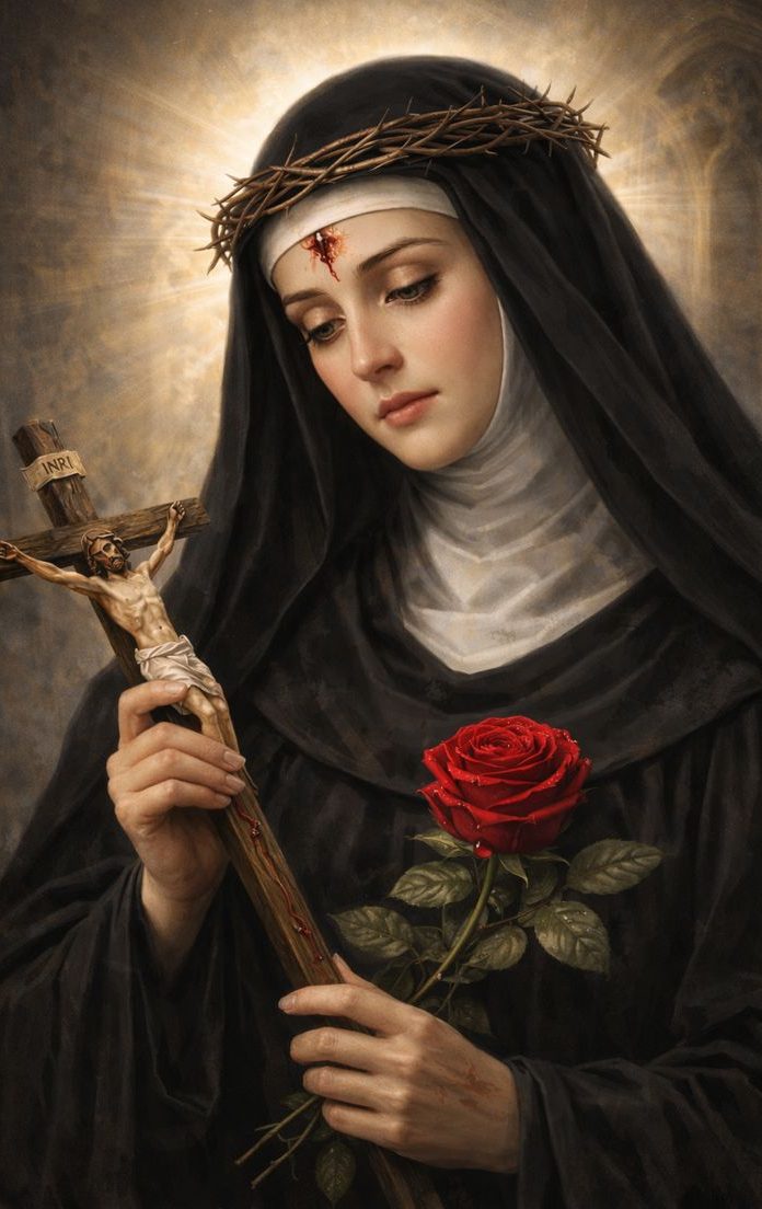 She reinitiated her original desire of becoming a nun by requesting to be accepted in a convent. Initially rejected by the Augustinian convent due to the stigma of her husband's murder, she finally entered the Monastery of St. Mary Magdalene at age 36. In 1442, after praying fervently for so long asking Jesus to allow her to share in His suffering, while in front of the crucifix meditating on the Passion of Jesus, she received a stigmata. A thorn shot out from the crown of thorns on the head of Jesus on the crucifix and pierced Rita’s forehead. It formed a painful, bleeding wound on her forehead, which she bore for 15 years.