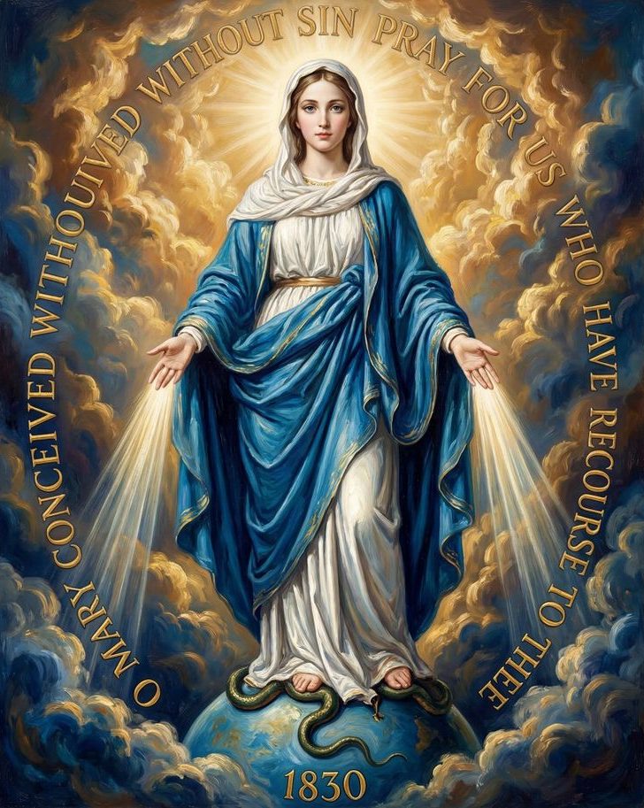 The vision then changed to show Our Lady standing on a globe with her arms now outstretched and with the dazzling rays of light still streaming from her fingers. Framing the figure was an inscription: “O Mary conceived without sin, pray for us who have recourse to thee.”